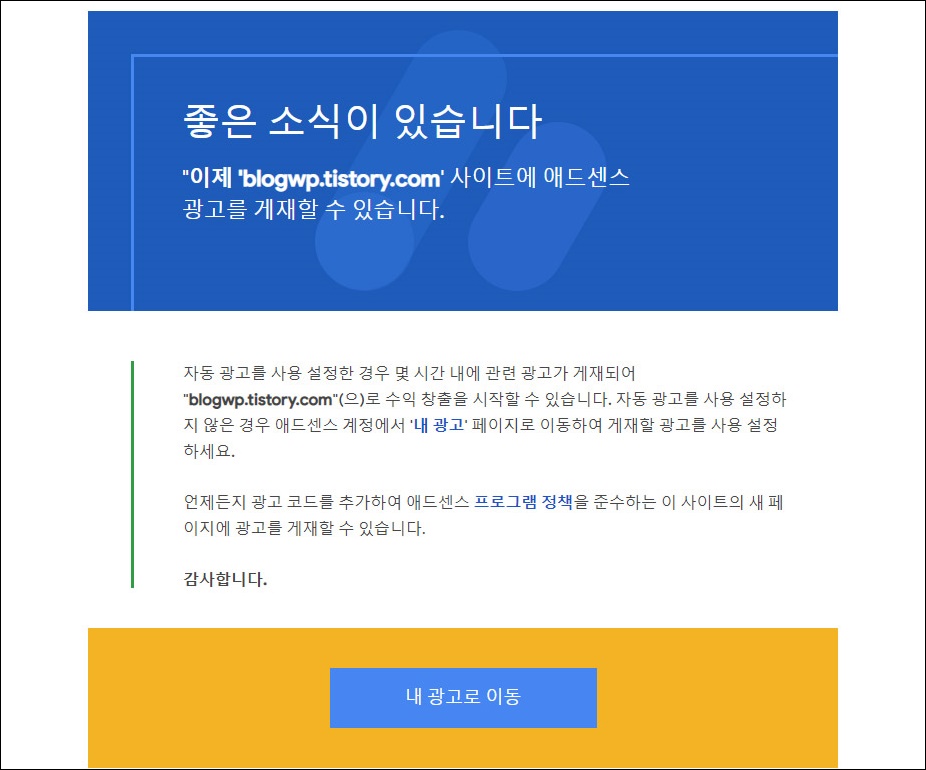 바로 이 티스토리 블로그에 구글 애드센스 광고를 게재해도 된다는 메일이었습니다.